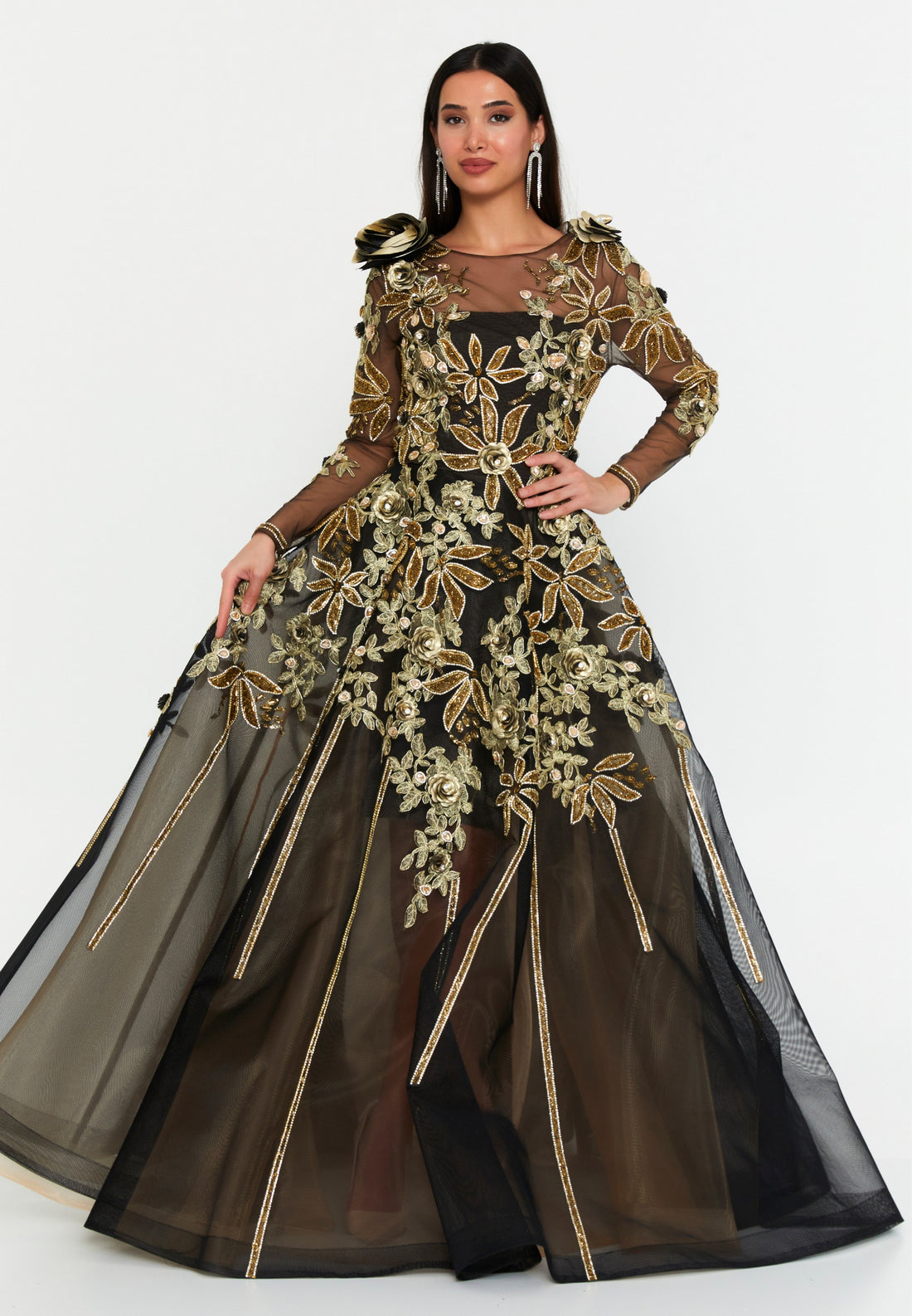 Long Sleeve Maxi Tulle A - Line Regular Prom Dress mtn88179